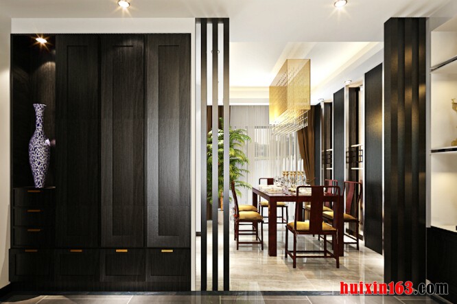 餐厅的装饰是以一个独立的空间存在的,整体的黑色实木门的框架让这个空间更具有神秘感可言,复古色彩的实木餐桌椅的搭配更是符合了新中式装修风格的特点,一个大型的金黄色的水晶吊灯的使用不仅让餐厅的奢华和温馨感骤升,产生的浓烈中式装修手法也是比较突出的,整个餐厅的气氛温馨和谐又不失去主人对生活品味的向往。