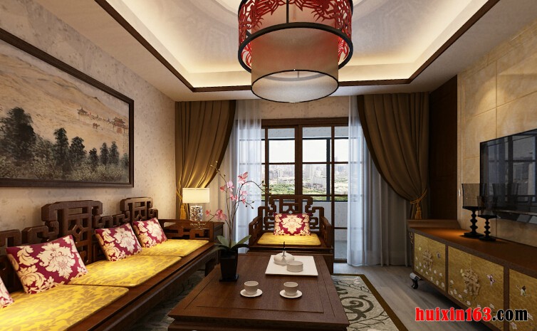 客厅的整体装饰奢华感比较突出,白色的石膏板顶面装饰加上实木雕刻的边框设计提升了顶面装饰感的复杂性,圆形的红色雕刻大吊灯的使用瞬间把客厅的中式气息和温馨气氛展现到最极致,实木地板的地面装饰增加了空间的舒适性能,实木雕刻的整体沙发家具装饰和金黄色的椅垫更加的把富丽堂皇和贵族的气息展现得更加的充分,电视背景墙和电视柜的存在更好的把中式的装修气氛浓郁的展现出来。