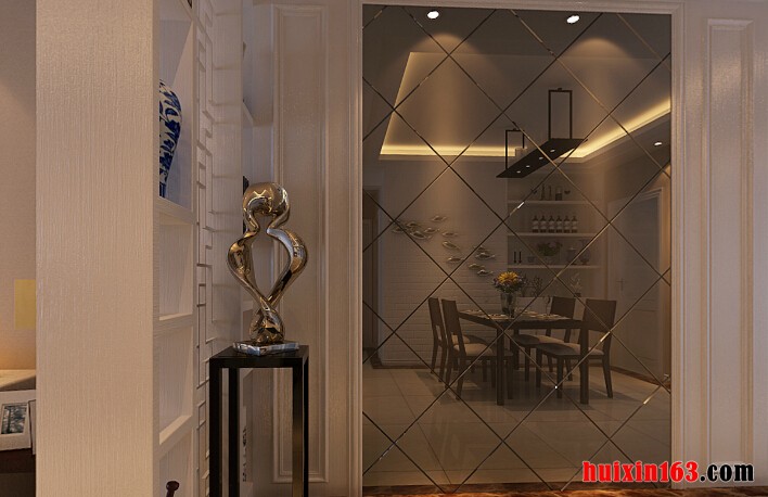 餐厅的打造比较宽阔简洁,实木的餐桌椅装饰搭配上一个玻璃画品把餐厅的气氛营造得更加的温馨和舒适,白色的立体感墙面有一个嵌入式的搁置架,既可以摆放漂亮的装饰品还可以提升主人的生活品味,立体造型的鱼挂饰把餐厅的立体造型提升到最高。