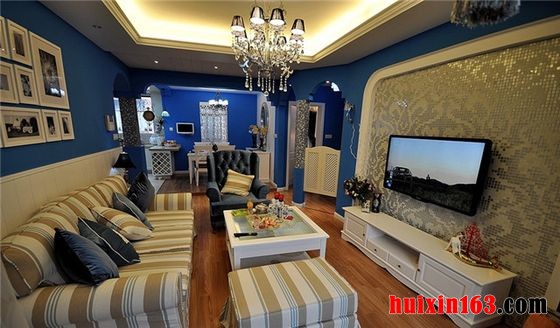 整个房间的装修以蓝色为主要的装修色调,电视背景墙采用了大面积的海洋蓝色进行装饰,彰显出更多的憨厚和干净的氛围,加上周围的白色的门套线以及白色的简约风格的家具给人的清爽感觉更加的丰富,客厅低啊面采用的是实木的地板装饰给人一种回归自然的感觉,白色的石膏板顶面造型配合灯光的装饰让客厅的温馨浪漫气氛更加的浓郁。
