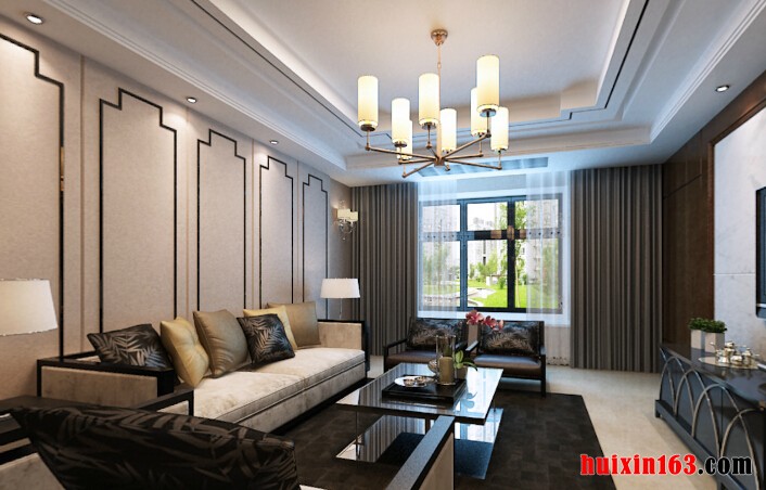 客厅的装饰具有现代化的装饰特点又透漏着中式的装修韵味,白色的顶面设计采用黑色的石膏线进行轮廓的打造,搭配上一个造型奇特的吊灯瞬间把空间的气氛和奢华感提升到最高,墙面的设计和顶面起到相互衬托的作用,加深了空间的开阔感和延伸性,大型的软装沙发和黑白花纹的抱枕为空间的时尚感带来更多的韵味,电视背景墙采用实木的构造能够把中式的装修特点很好的展现出来。