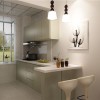 餐厅就在客厅的旁边,餐厅的墙面采用了各种颜色条纹装饰的壁纸进行装饰,玻璃面的餐桌和白色的餐椅搭配更具有简洁舒适的气氛,一个大型的圆形吊灯的使用让空间的舒适温馨感更加的浓郁,墙面上一个白色的实木搁置架既可以进行物品展示带来的收纳作用也是比较突出的。